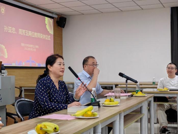 Also, teacher representatives shared their memories with Prof. Sun Yazhong and Assoc. Prof. Zhou Fangyu. Shen Boping recalled Sun’s decades of career at Nanjing University and mentioned, “he is both a teacher and a helpful friend for me, supportive of my work and life.” Gan Jiguo expressed his admiration for Zhou Fangyu. “She has a passion for teaching ideological and political courses and is dedicated to her duties. Also, she is well-known for her devotion to the School, concern for colleagues, and selflessness. Furthermore, she enjoys life with various interests and hobbies while leading an elegant lifestyle. I wish her a happy retirement life.”