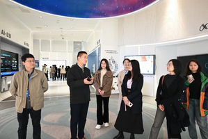 在科大讯飞教育BG方案策略部总监关东和江苏分公司高教行业区域经理刘海涛的陪同下,师生一行首先参观了讯飞人工智能展示厅。展示厅内,讲解员介绍了科大讯飞在翻译、工业、教育和城市建设等方面的前沿人工智能产品。在智慧教育领域,讲解员展示了自动识别板书的智慧黑板,自动批改题目的智能批阅机和定制学习路径的个性化学习系统。同时,展厅通过互动演示展示了讯飞星火4.0Turbo大模型的多领域能力,包括文本生成、逻辑推理和跨模态理解。师生们不仅直观感受到科大讯飞的技术实力,还深入理解了AI如何从实验室走向千行百业,成为推动社会发展的核心引擎。