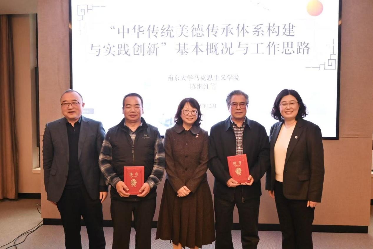 教授陈继红代表课题组向与会领导和专家汇报“中华传统美德传承体系构建与实践创新”课题基本概况与研究思路。各子课题负责人就各自的具体工作进行专门汇报。