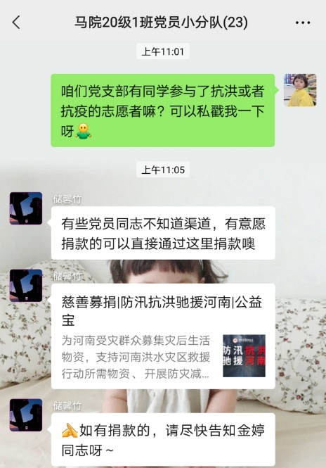 一场罕见的极端强降雨,在郑州等多个城市引发洪灾;南京疫情突然复发,全城连夜紧急部署。无情的病毒和风雨面前,马院青年积极响应组织号召,经过培训后坚守抗疫一线,守护我们的美丽南京。各党团支部成员也自发通过网上捐赠通道捐款,与河南同胞守望相助,尽绵薄之力。