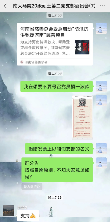 “青山一道同风雨,明月何曾是两乡”。听闻河南大地洪水肆虐,各党支部、团支部发出倡议,呼吁党员团员们积极为河南灾区捐款,得到党员团员们的踊跃支持。