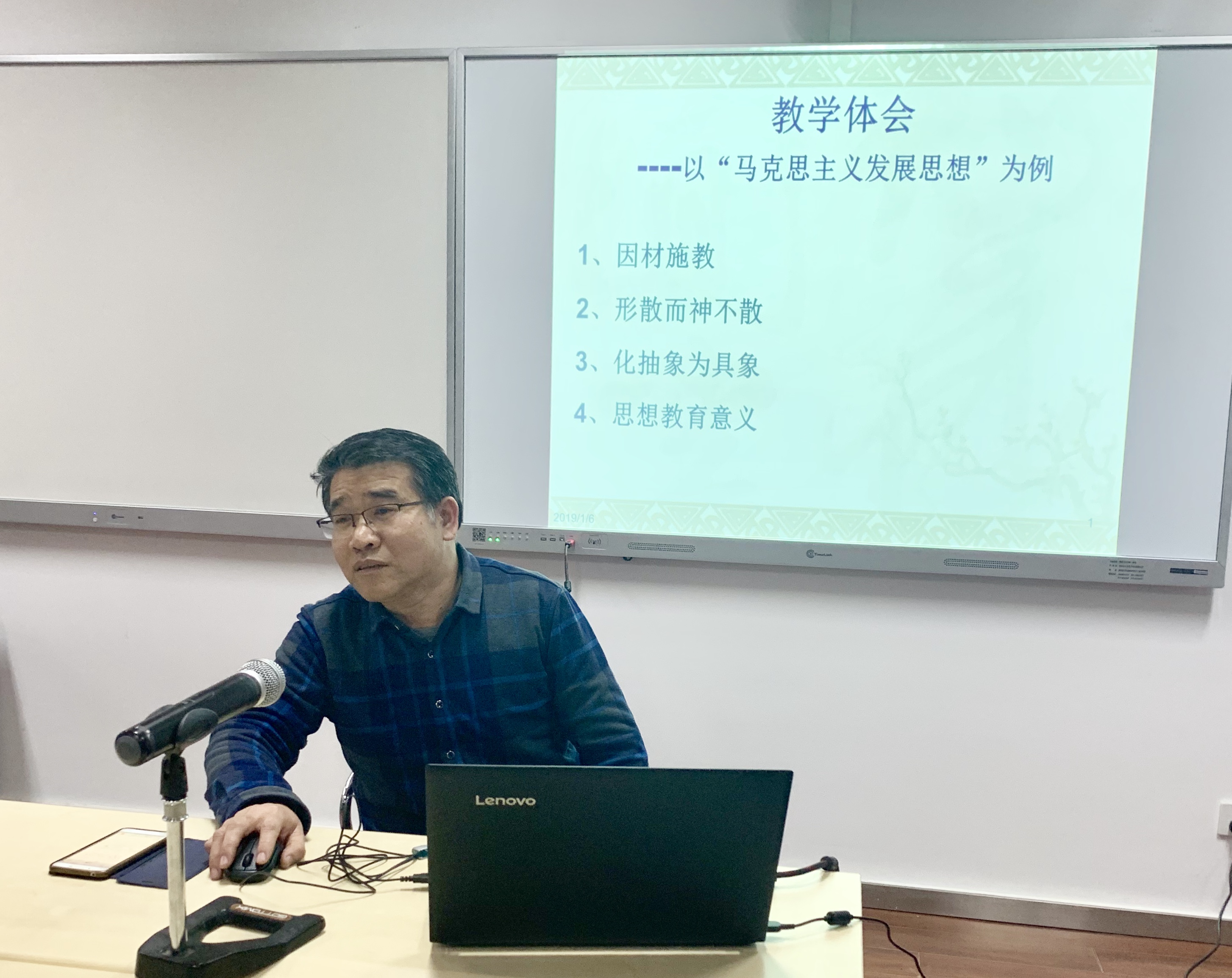 学院教师代表就自己的教学经历详谈相关课程的教学及改革经验。沈伯平教授以“混合教学模式在高校思政课中的运用实践与体会”为主题,展现混合教学模式在《毛泽东思想与中国特色社会主义理论体系概论》课程中的现实运用。王锁明教授以“马克思主义发展思想”为例,结合教学案例,从因材施教、形散而神不散、化抽象为具象、思想教育意义四个方面畅谈教学体会。李喜英教授就《思想道德修养与法律基础》课程的混合式教学分享了自己的教学经验,同时指出,教师队伍建设需要扬长避短,翻转课堂本身的内容以及评分政策有待继续更新与细化,实践教学模式需进一步探索。