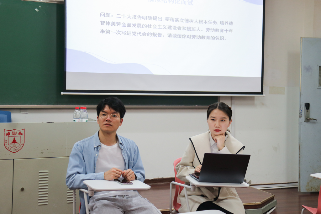 2020级马克思主义基本原理专业的何鑫乐学长及思想政治教育专业的徐金婷学姐进行分享,会议由董梦圆同学主持。两位学长学姐从招考条件、信息获取、择校考量及笔面试准备等方面,对中学教师招聘进行多维分析,向参会同学传授求职经验。在结构化面试模拟环节,两位学长学姐通过一对一面试辅导的方式,在实战演习中传授面试技巧。