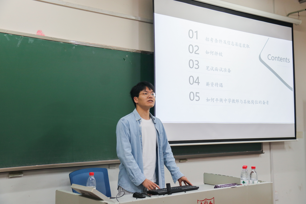 徐金婷学姐首先从职业规划定位入手,建议大家理性评估自身条件与中学教师能力素质的适配度。其次,学姐基于自身丰富的备考经验,从备考时间轴、简历册制作、具体学校考试内容及课程设计等方面进行详细分享。学姐指出,在准备简历时,应着重阐述宣讲经历、教学实习经历及科研能力三个板块,尤其应重点打磨教学实践经历板块;同时学姐建议简历后可附带图文小册,通过图文并茂的形式吸引面试官目光。此外,学姐还以南京外国语学校笔面试为例,向大家传授结构化面试应对策略,建议面试前对应聘学校进行全面了解,针对学校特点设计课程活动形式。最后,学姐为大家详细介绍备课经验,特别是议题式课程备课方法。学姐鼓励大家注重日常积累,拓展课程活动形式,通过议题式教学法及多样化素材激发学生思考潜力。