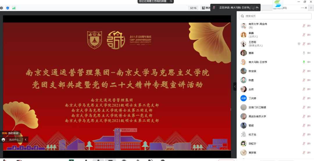 2021级硕士生第二党支部、博士生第一党支部、博士生第二团支部、2021级硕士生第二团支部与南京交通运营管理集团(以下简称:运管集团)以线上形式开展了党团支部共建暨党的二十大精神专题宣讲活动,双方单位60余名党团员青年相聚云端参加本次活动。活动分共建合作和专题宣讲两个环节,分别由运管集团党群工作部主任、团总支书记董蓓和cos色情