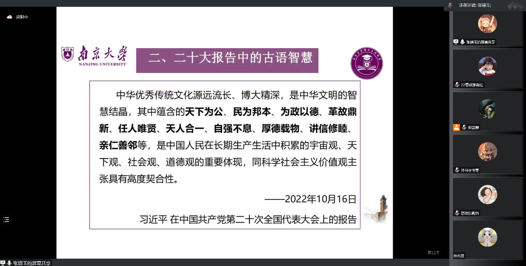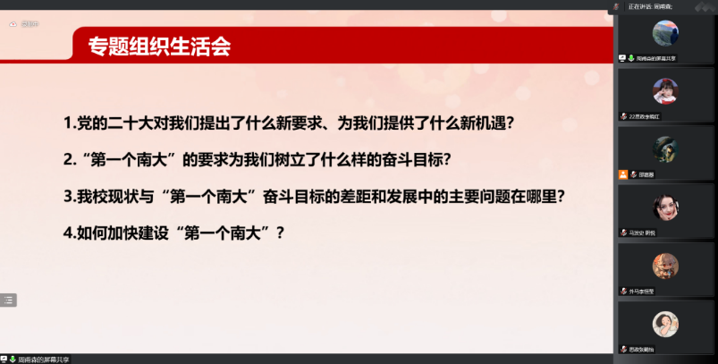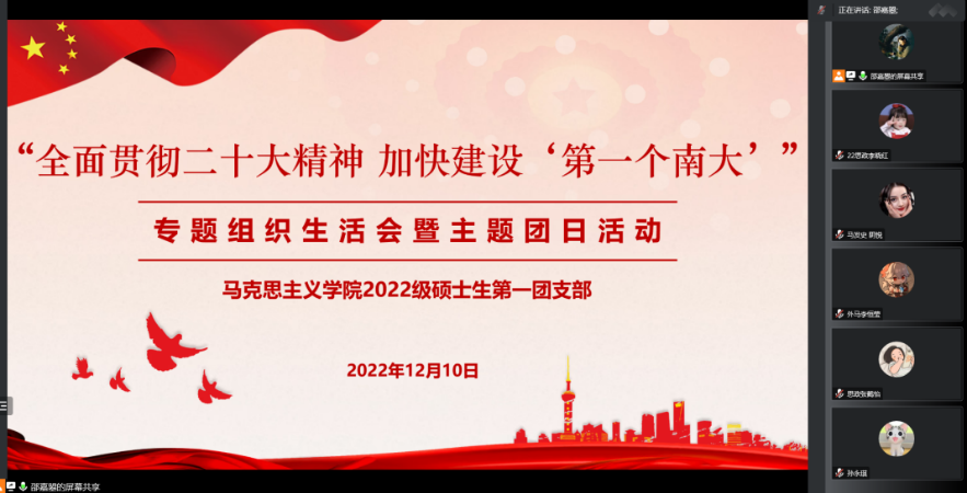 2022级硕士生第一团支部开展“全面贯彻二十大精神 加快建设‘第一个南大’”专题组织生活会暨主题团日活动,通过全员参与、广开言路,聚焦问题、建言献策,充分讨论、集思广益,不断增强共青团组织引领力、组织力、服务力,进一步引领班级青年参与建设有中国特色、南大特质、时代特点的“第一个南大”。本次活动采用线上形式,由2022级硕士生第一团支部书记邵嘉曌、副书记周甫森、组织委员张睿思共同主持,cos色情