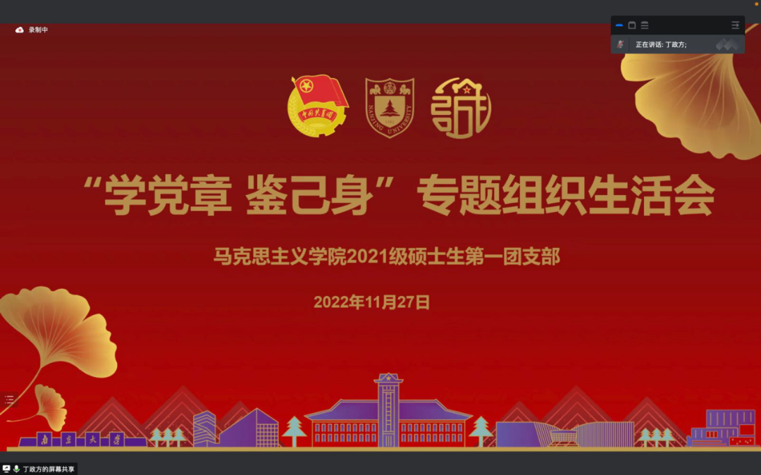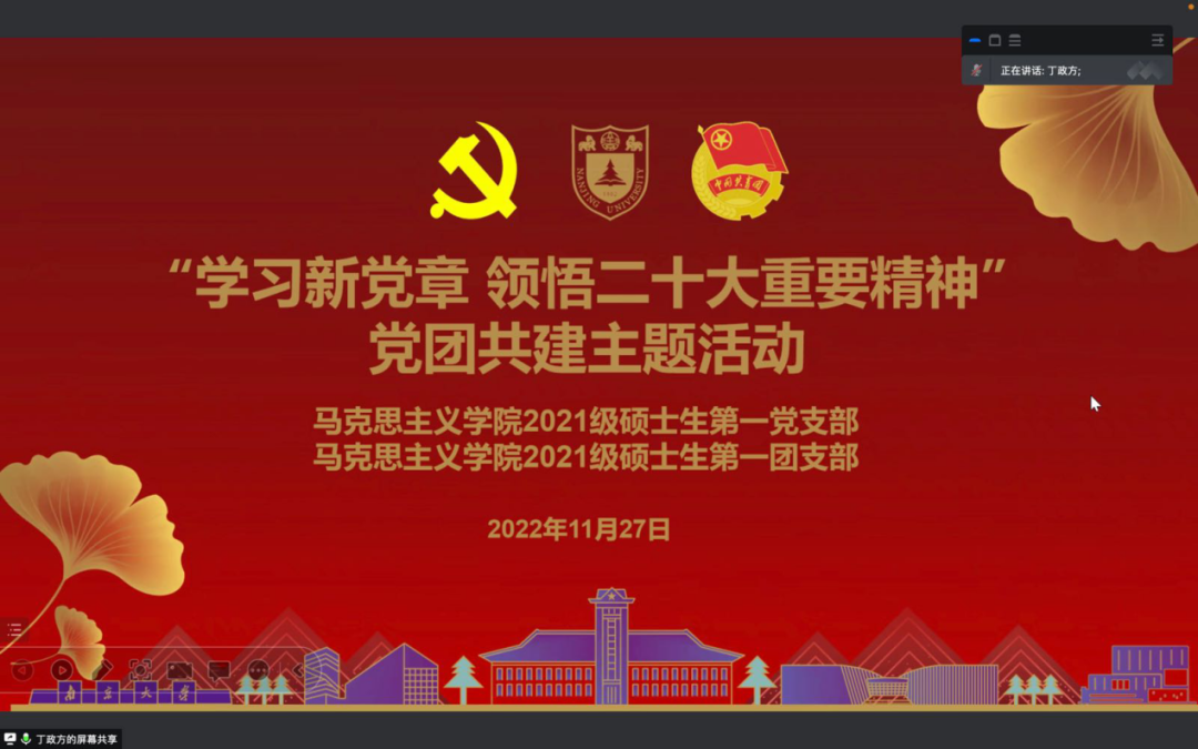 党章是全党必须共同遵守的根本的、最高的行为规范,是深入推进新时代党的建设的伟大工程的总遵循,是学习贯彻党的二十大精神的关键一环。为持续学习贯彻党的二十大精神,深入领会新修订的《中国共产党章程》,2022年11月27日晚,2021级硕士生第一党支部联合2021级硕士生第一团支部开展“学习新党章 领悟二十大重要精神”党团共建主题活动。本次活动由硕士生第一团支部书记丁政方同学主持,由硕士生第一党支部万素军同学带来新党章学习主题分享。