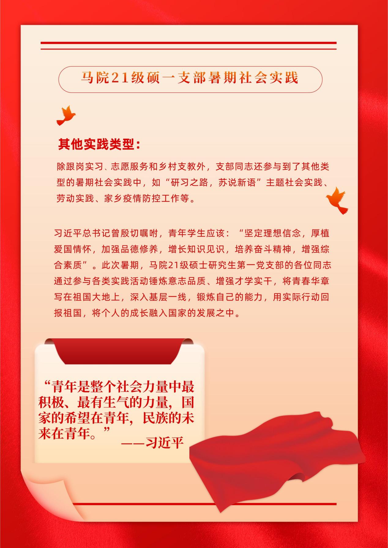 2021级硕士生第一党支部对暑假进行了实习、实践和支教活动的同学们进行了采访,帮助同学们了解实习、实践的渠道和工作内容等,展现了青年学子不负韶华、激扬青春的风采和南马学子的担当与使命。