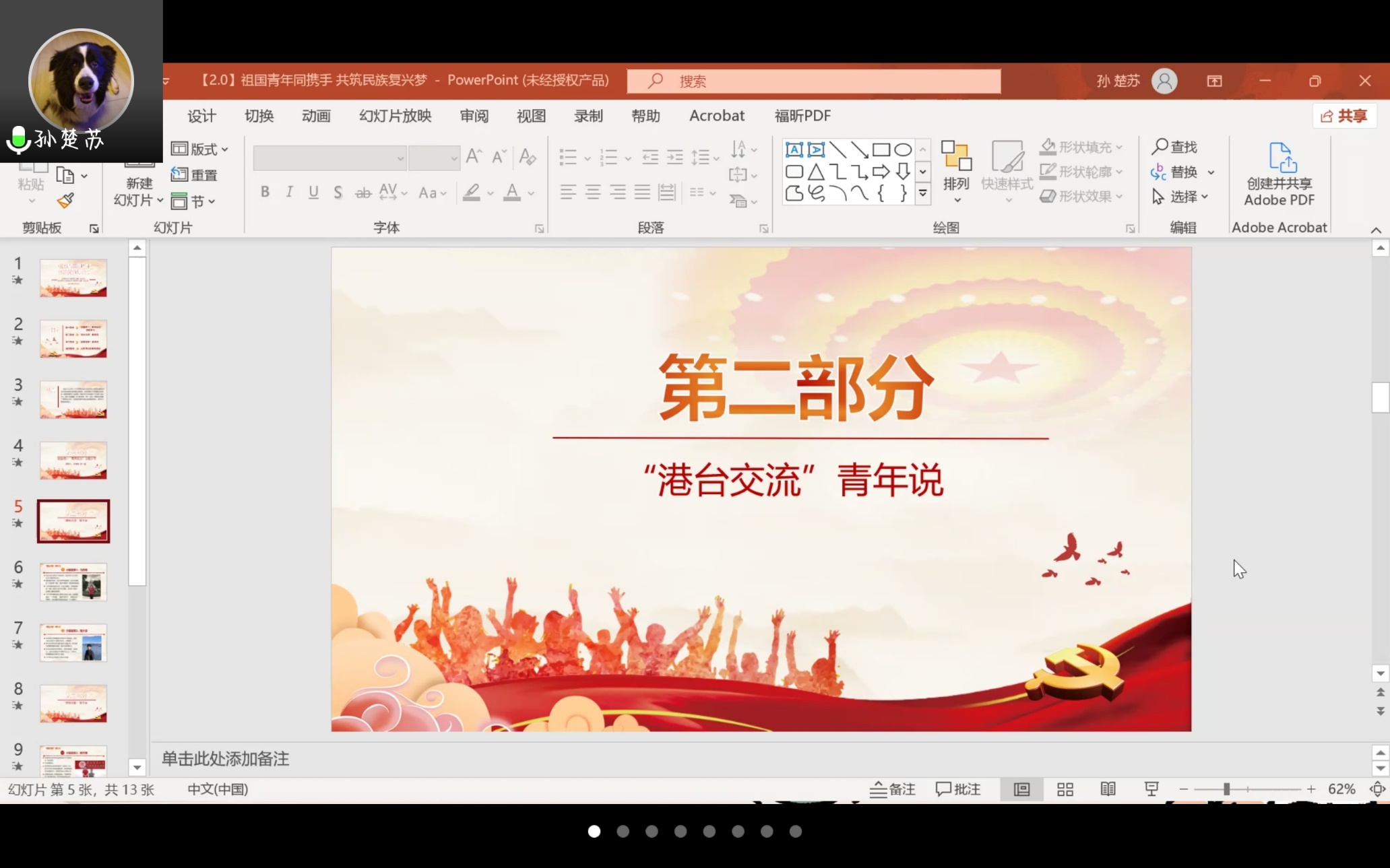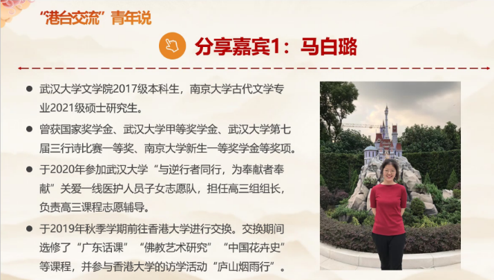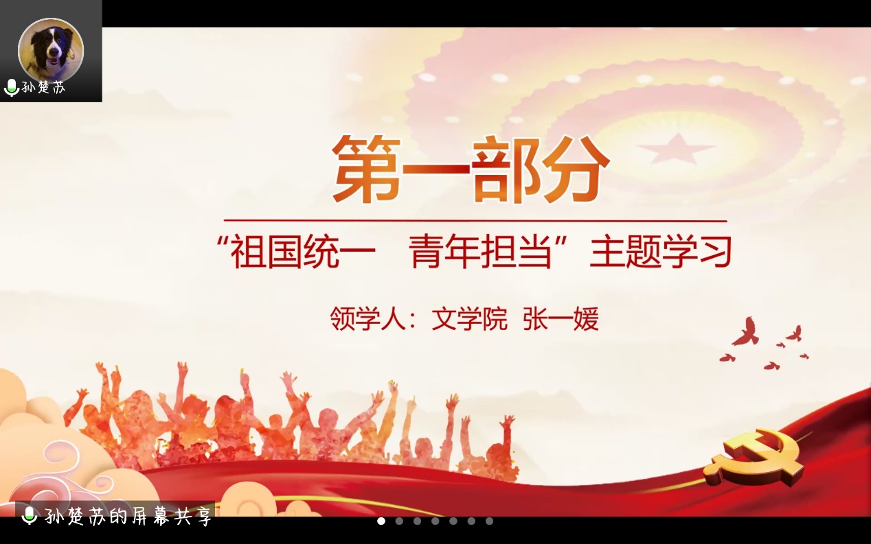 2021级硕士生第一党支部成员孙楚苏同志介绍了活动的整体流程,文学院2021级硕士生第二党支部书记张一媛同学为带领同学们进行“祖国统一,青年担当”主题学习。张一媛同学通过短视频与大家一同回顾了习近平总书记的香港之行,并重温习总书记在庆祝香港回归祖国25周年大会的讲话以及7月11日给参加海峡青年论坛的台湾青年的回信精神,她提出三点倡议:一是携手港澳台青年,做好沟通的桥梁;二是讲好大陆故事,让港澳台青年了解大陆,主动融入中华民族大家庭;三是肩负时代使命,与港澳台青年筑梦圆梦、互学互鉴,把个人梦想融入中华民族伟大复兴的中国梦,让青春在时代征程上绽放异彩。