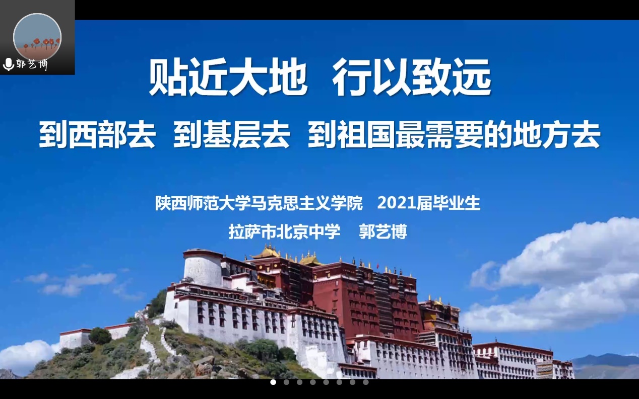 2021届毕业生郭艺博当前正于西藏从事教育工作,从前期的紧张忐忑,对当下充满未知感,到深入实践,行知感受,克服对未来的无力感,再到投身支教,心怀热勇,践行生命的意义感,她坚持用自己的身体力行去实现“贴近大地,行以致远,到西部去,到基层去,到祖国最需要的地方去”的人生理想,使支部成员认识到了个人价值追求与祖国需要、祖国复兴使命的交融。