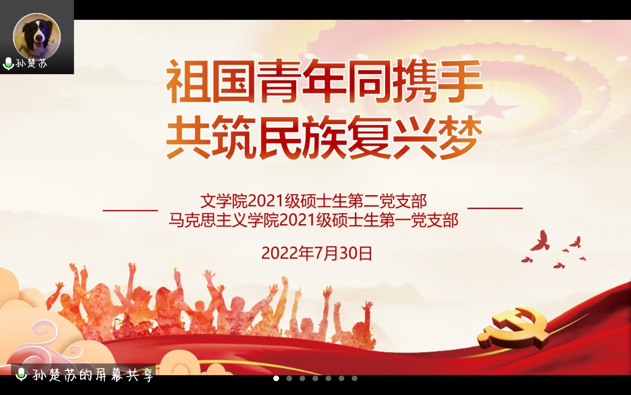 2021级硕士生第一党支部联合文学院2021级硕士生第二党支部于2022年7月30日晚七点共同开展“祖国青年同携手,共筑民族复兴梦”主题党日活动。通过讲述青年奋斗故事,展现青年理想担当,激励青年扎根祖国大地,为实现民族复兴梦而不懈奋斗。本次党日活动由cos色情