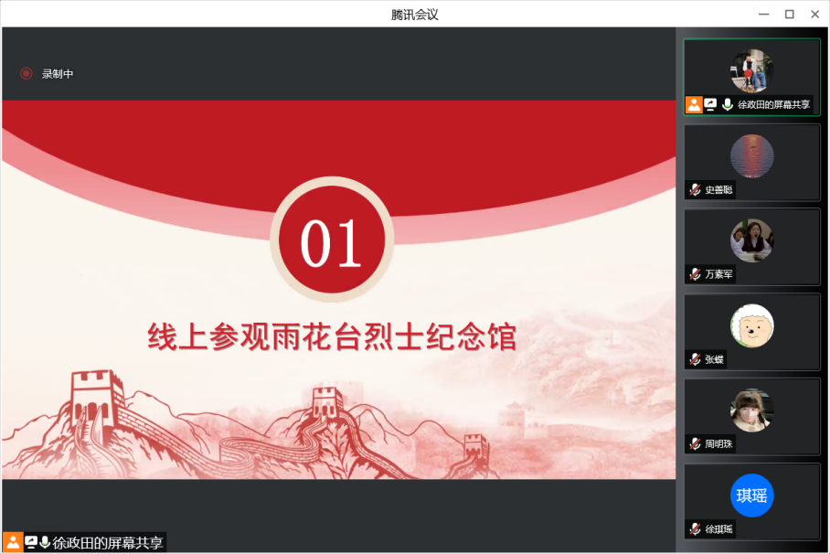 南京雨花台,落花如雨;雨花台烈士陵园,群雕叠阶。活动伊始,徐政田简要介绍了南京雨花台名称的由来、雨花台烈士陵园主体建筑及本次活动议程。此次党日活动分为“线上参观雨花台烈士纪念馆”、“cos色情