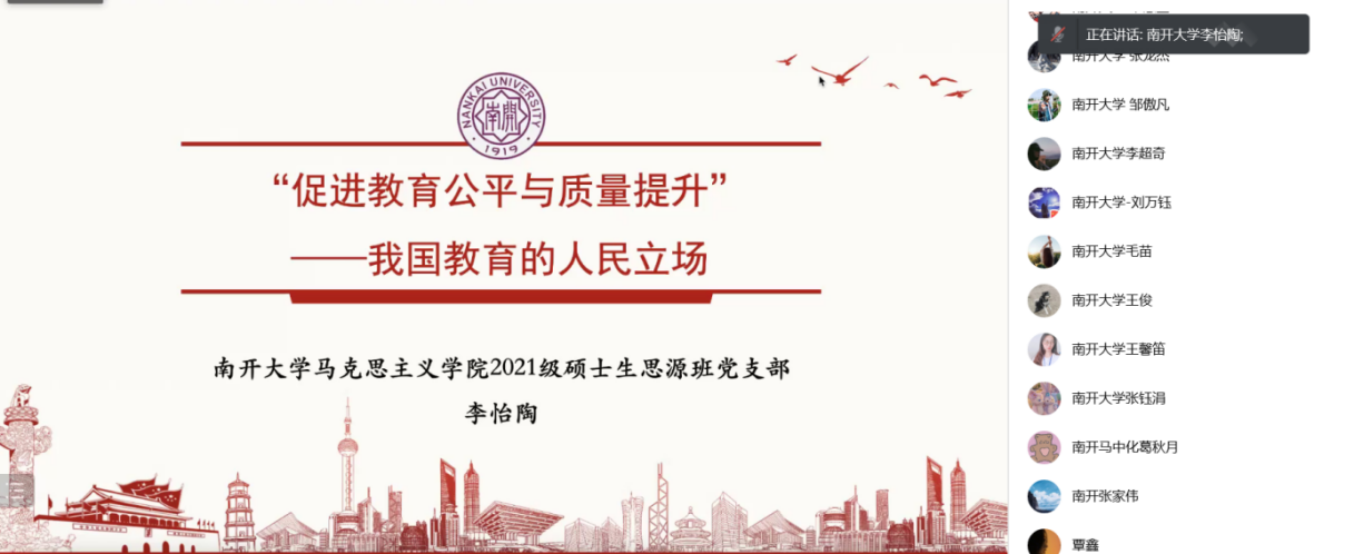 2021级硕士生思源班党支部代表李怡陶同志发言,发言主题是“促进教育公平与质量提升——我国教育的人民立场”,由两会的政府工作报告出发,阐述了我国教育事业的人民立场与发展方向。