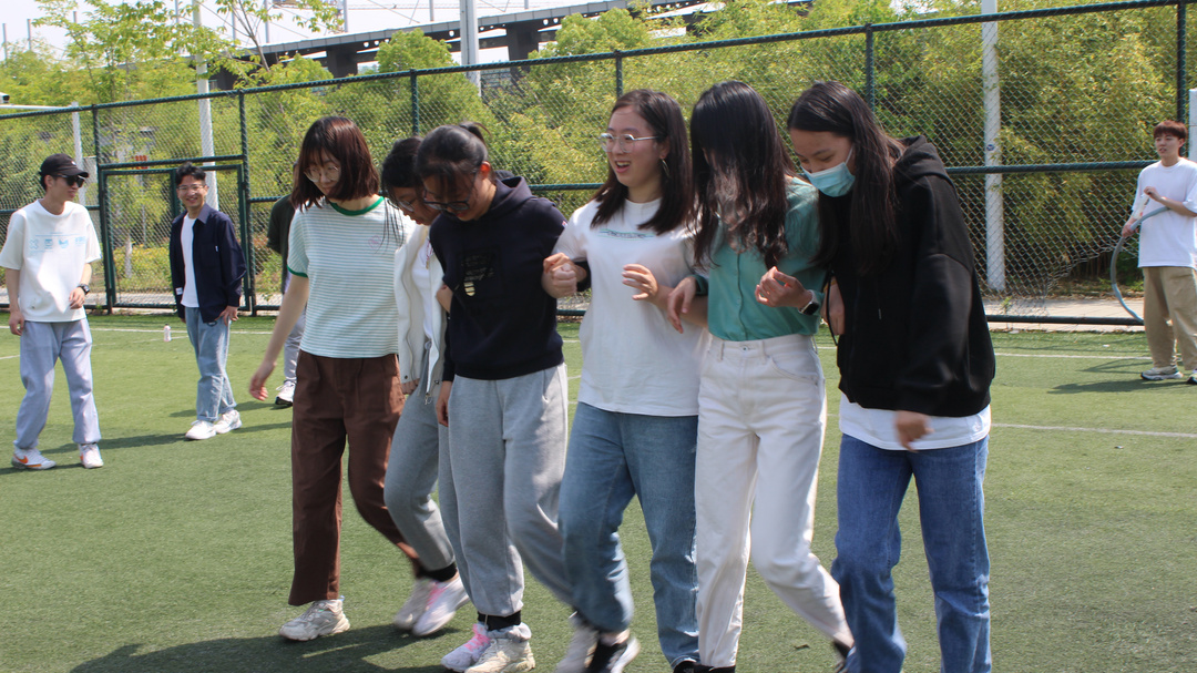 各个队伍6人腿系绑带,携手前行奋力奔跑。比赛氛围十分热闹紧张,有的队伍乱了阵脚、步伐不一,经简单调整后又继续前行;有的队伍喊着“1、2!1、2!”的口号迈出整齐步伐;有的队伍配合颇具默契,好似离弦之箭,把对手远远地抛在身后。不管成绩如何,大家始终元气满满,为彼此加油鼓劲。