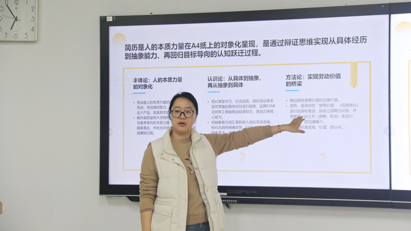活动最后,路老师对简历内容提出了两大优化建议:一是采用成果导向的写作方式,善用数据和事实量化成绩,增强说服力;二是提升故事化表达能力,平时注意记录事件细节,建立个人经历素材库。她鼓励同学们合理利用AI工具辅助优化简历排版与表达,但必须融入自身的深入思考与清晰定位,让简历真正成为个人职业品牌的亮眼名片。