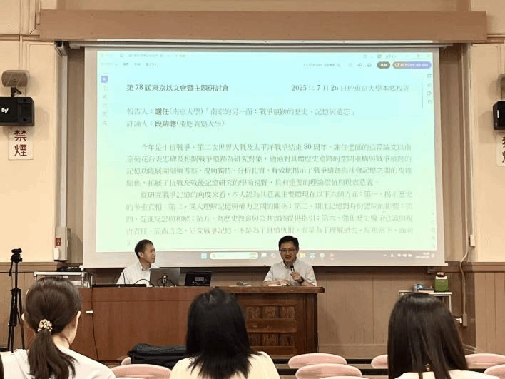 作为学术交流的重要组成部分,谢老师积极与日本学界同仁展开对话。他抵日之初拜访了早稻田大学高嶋航教授,就研究课题和史料查阅问题进行了探讨。在东京大学,他参加了由陈捷教授主持的知识史课程、孙青老师的新书分享会,以及“近代日本汉文文献与东亚社会”学术研讨会。此外,他还参加了第七十八届东京以文会暨“东亚与复数的战后”主题研讨会,并作为报告人之一分享自己的研究心得。其报告获得了与会师友的好评。